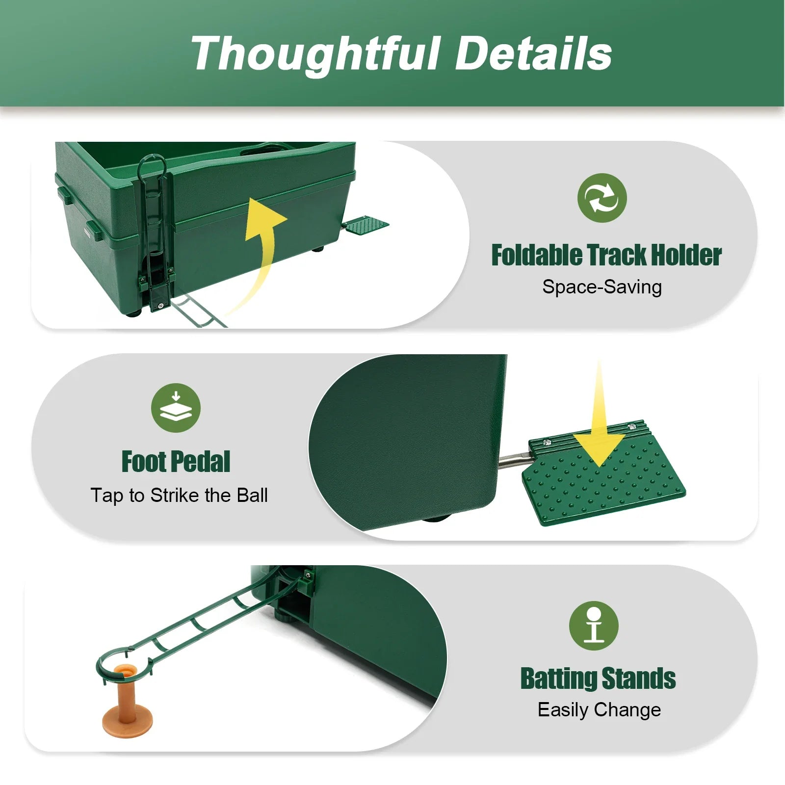 Batting Stands: 3 batting stands that you can easily change without having to buy additional ones.